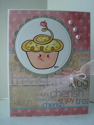 This little cutie is the latest image from Heidi, and he's adorable. This one is my favorite so far. I colored him in with Copic markers, then added pearls for accents along with ribbon. The frosting also got a bling makeover when I added Stickles Glitter Glue.