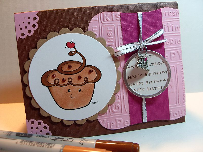 This cutie was colored in with my Copic markers. I used a Cuttlebug folder to emboss the pink cardstock, then added my saying and a charm for a bit of bling.